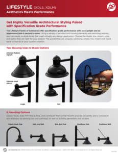 The Lifestyle Family of luminaires offer specification grade performance with zero uplight and an appearance that is second to none. Using a variety of architectural housing elements and mounting options, you can create multiple looks that meet virtually any design application. Choose the shade, size, mount, color, and optics that are right for your project. The possibilities are uniquely satisfying; simply mix, match and stand back to marvel at your custom creation.